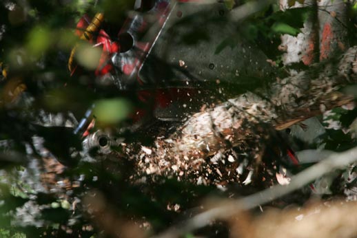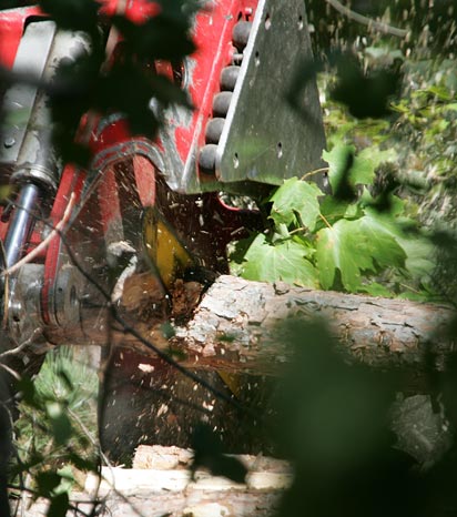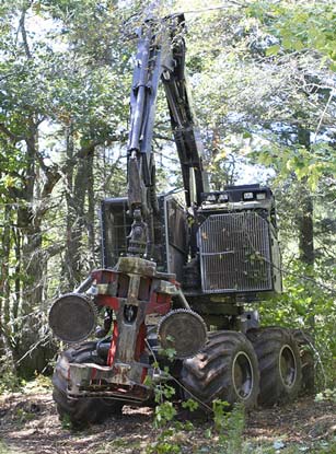The logging unit shown here is an impressive machine. It secures, cuts, and lowers the tree. It then is used to lift the tree and strip the small branches as it cuts the long trunk into manageable sections. The entire process is very fast. Within the half hour or so during which these photos were taken, a number of trees were processed.