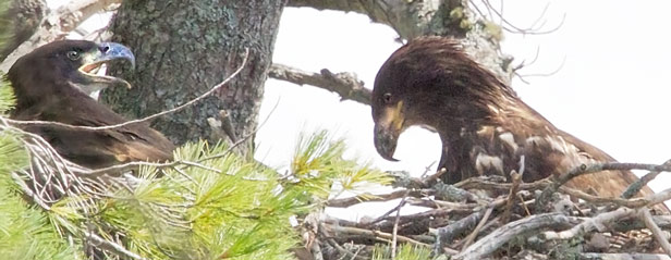 August 5: While watching the eaglet that had returned to the nest for the first time since it first left on July 26th, it became apparent that it sounded a little different and it looked darker. A closer examination revealed two eaglets were at the nest. The one hatched in the nest this year was somewhat hidden in the corner, while the darker and slightly larger one strutted around as if it owned the nest. The Gratiot Lake eaglet was obviously not happy and jumped at the invader and tried to push it unsuccessfully and retreated back to its corner. |
