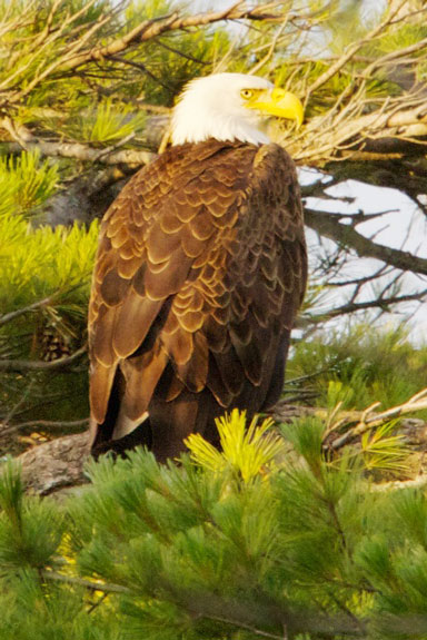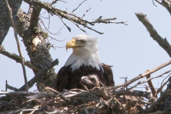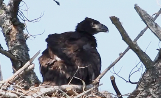 June 5-30: Eagles have returned to the nest which was abandoned after it partially collapsed a few years ago. As you can see in the photo, an inquisitive eaglet inhabits the nest. He/she can easily be heard asking for food several times a day. The eaglet is growing and learning quickly. It was toilet trained weeks ago shortly after it could waddle to the edge of the nest. Although it still is sometimes fed by an adult, it also appears to be learning to feed itself from the fish which are flown in several times a day. The eaglet can frequently be seen stretching its relatively large and quickly developing wings. Although it is not yet ready to venture out of the nest to sit on a branch, it sometimes sits near the edge of the nest looking intently at nearby branches. In the short time we have been observing, it has already gone from being a cute, little, fluffy eaglet to being a much larger, more gangly, and more demanding youngster.