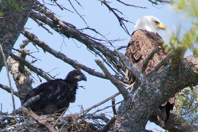 July 10: The eaglet is spending much time on branches and gets a little braver and farther out from the nest each day. An adult today fed the eaglet while it was still perched up on the branch next to the nest. (Video will soon be added to the selections below.) |