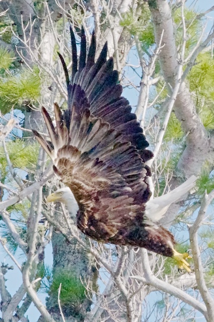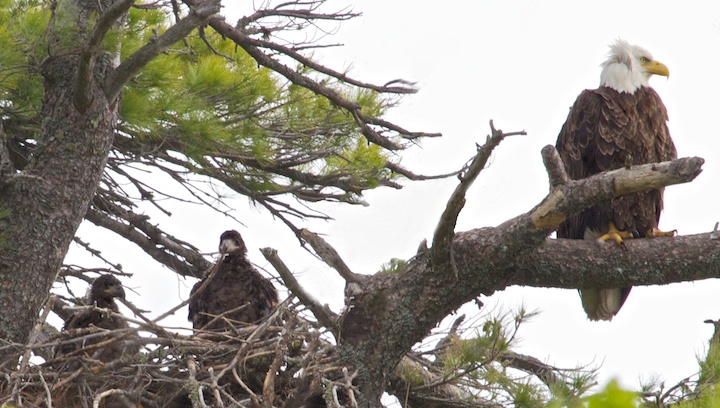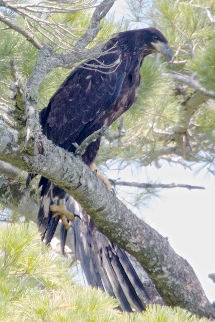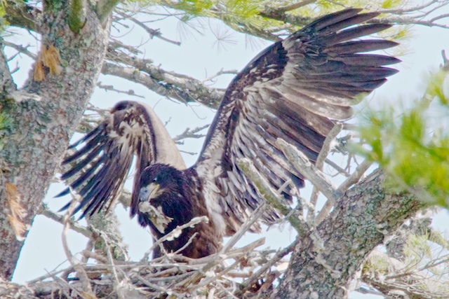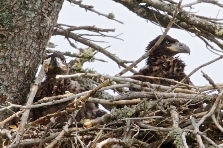 June 2-24: Upon our arrival in the UP in early June, it was evident there was an eaglet in the nest. At the first opportunity to view a feeding, it soon became clear there were two eaglets. During the first week of June and into the second, there always seemed to be an adult in the nest or on a tree limb next to the nest. That quickly changed and the adults, although not far away, prefer trees nearby the nest tree. One of the adults can often be heard calling. The eaglets watch everything, sleep, preen, explore the nest, flap their wings, or cry to be fed. The amount of time spent sleeping has greatly decreased over the past few weeks. The amount of time spent calling for food has significantly increased.
