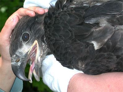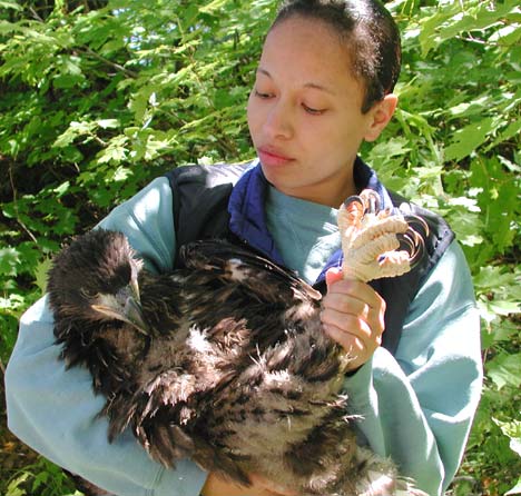 The baby weighed in at six pounds nine ounces. Feather appearance, size, and wear showed he was seven weeks old. Blood and a few feathers were taken for analysis, and a coded band was put on his leg to allow birders to track his movements.