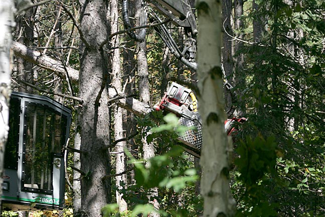 The logging unit shown here is an impressive machine. It secures, cuts, and lowers the tree. It then is used to lift the tree and strip the small branches as it cuts the long trunk into manageable sections. The entire process is very fast. Within the half hour or so during which these photos were taken, a number of trees were processed.