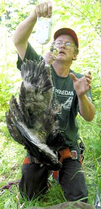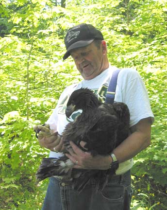 On July 1st, Joe Papp came to Gratiot Lake to band one male eaglet. The baby was in good condition and the pike bones in the nest gave a clue of his good diet. An unhatched egg found in the nest and blood and feather samples taken from the eaglet will be analyzed to determine heavy metal, PCB, and pesticide content.