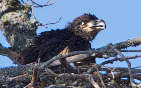 June 5-30: Eagles have returned to the nest which was abandoned after it partially collapsed a few years ago. As you can see in the photo, an inquisitive eaglet inhabits the nest. He/she can easily be heard asking for food several times a day. The eaglet is growing and learning quickly. It was toilet trained weeks ago shortly after it could waddle to the edge of the nest. Although it still is sometimes fed by an adult, it also appears to be learning to feed itself from the fish which are flown in several times a day. The eaglet can frequently be seen stretching its relatively large and quickly developing wings. Although it is not yet ready to venture out of the nest to sit on a branch, it sometimes sits near the edge of the nest looking intently at nearby branches. In the short time we have been observing, it has already gone from being a cute, little, fluffy eaglet to being a much larger, more gangly, and more demanding youngster.