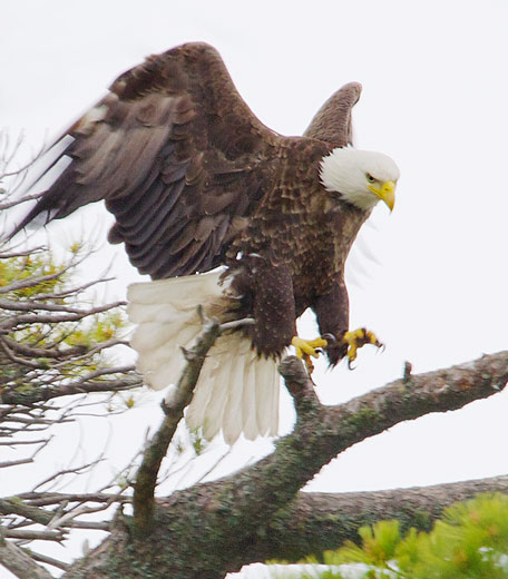 July 11-13: During the busy two weeks since the June entry above, the eaglet has grown a great deal, and it has gotten much more active. It has also learned (after much crying/squeeling) to tear apart its own food once it has been delivered. On July 10th, after days of flapping wings, hopping around in the nest, and studying locations of branches, the eaglet finally made it to a branch a few feet above and to the side of the nest. Since then it has spent several hours each of the last few days sitting in this location along with practicing hanging on and getting up and down. Since this resting place is partially in the path of the adults who operate the "Meals on Wings" program, there have been some minor mishaps with slight collisions and missteps as the youngster hurriedly races to get back into the nest when deliveries occur.
