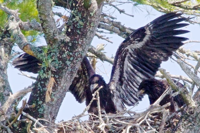 Over the past week, the eaglets have grown quickly, and what were stubby wings only a couple of weeks ago have become impressively feathered. It is difficult to tell them apart, except at feeding time. While early on there seemed to be some orderliness to mealtimes with each getting a turn as the other seemed to wait, now feeding time is always frenetic with one seeming to demand all and clearly taking a larger portion. The other has a less aggressive approach but manages to get fed using his own tactics.