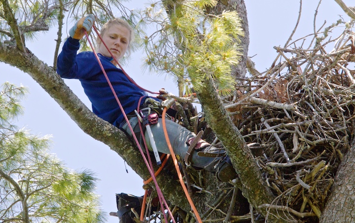 Both Gratiot eaglets are male. The larger male probably hatched a bit earlier. He weighed 7.50 lbs. His smaller brother weighed in at 6.393. Average weight for a full grown eagle is about 12 lbs. |