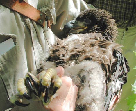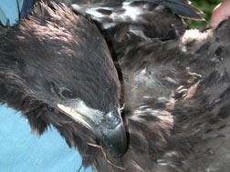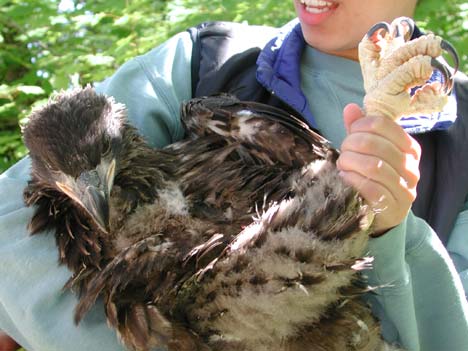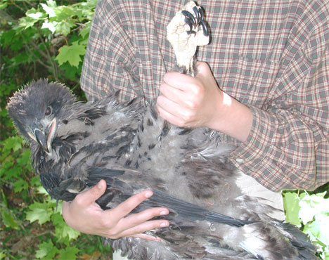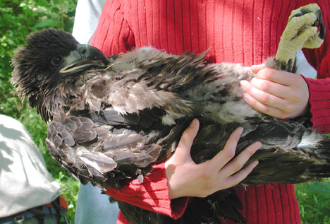 The baby weighed in at six pounds nine ounces. Feather appearance, size, and wear showed he was seven weeks old. Blood and a few feathers were taken for analysis, and a coded band was put on his leg to allow birders to track his movements.