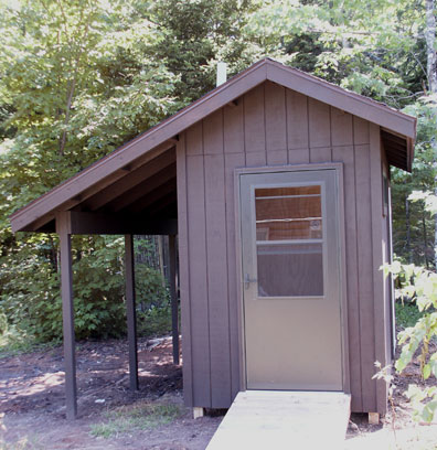 No running water, but a step up from the Conservancys privy, the new shed houses a composting toilet. The Sun-Mar Self-Composting Toilet is an example of an alternative to water flush toilets and a septic system. A fan and heating coil accelerate the decomposition process (at the Noblet cabin this is powered by the solar panel). The unit is self-contained and requires some maintenance. Wood chips or peat must be added on a regular basis and the drum must be cranked to rotate every few days when in use. When used only a few months out of the year, the compost, which is suitable for use on shrubs and flower gardens, is removed once a year.